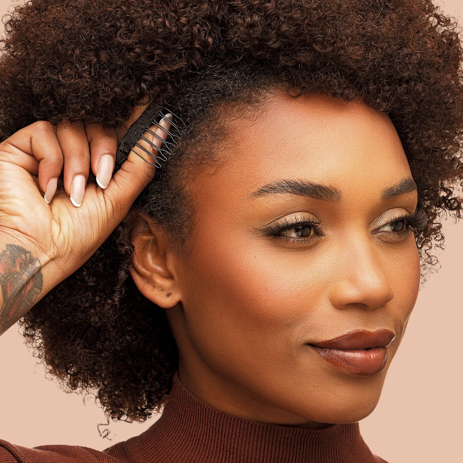 Com cabelo natural com a textura igual ou diferente da textura do cabelo do aplique.